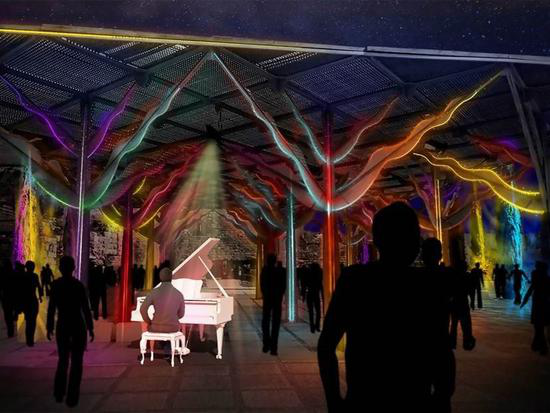 以“宫商角徴羽”传统五音文化为理念打造的海心沙作品区域是本届灯光节的核心和重点区域。