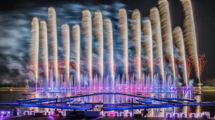9月19日,人们在塔林“奇幻灯光节”上观赏声光喷泉。在华竣国际打造的超1000项展馆案例中,这一技术也曾多次运用。